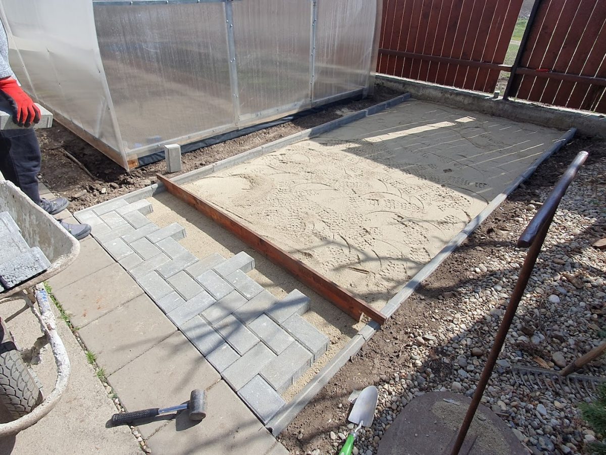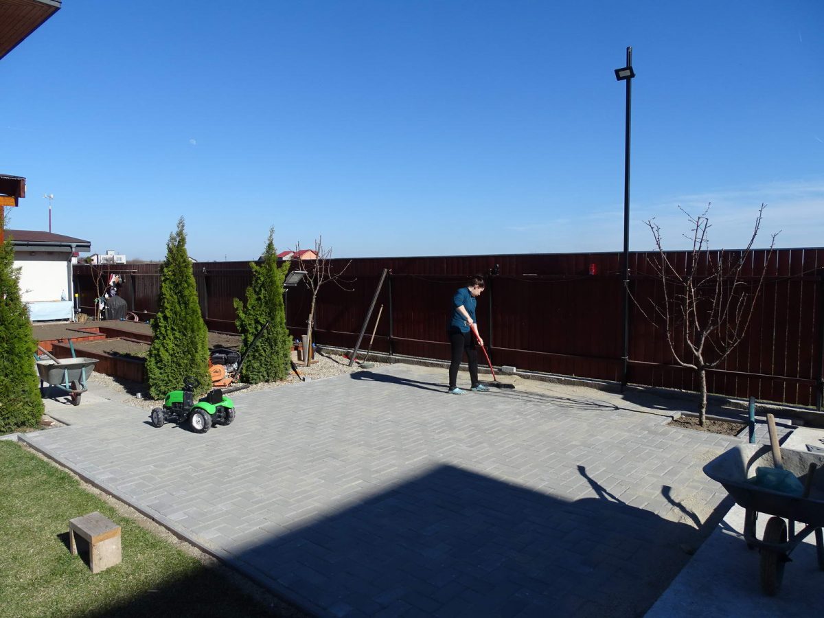 Pentru asta am pregătit terenul, am întins un strat de nisip de 3-4cm pe care apoi l-am bătut bine cu un mai. În mod normal se pune piatră vreo 10cm, care se bate, apoi 3-4cm de nisip. Am trecut și peste această etapă. Am pus doar nisip pe care l-am bătut bine.