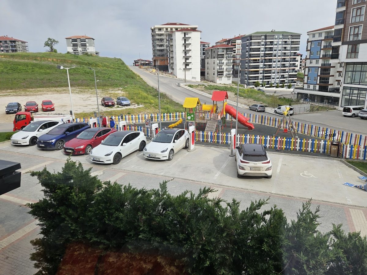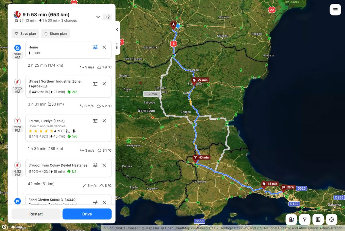 Am mers mai economic decât estimase aplicația. Prima oprire a fost la Târgoviște, unde am ajuns cu o autonomie mai mare decât era prevăzut, așa că am încărcat mai puțin. A doua oprire a fost în Edirne, la Superchargerele Tesla. Am profitat de pauză pentru prânz la restaurantul de lângă, iar când am terminat de mâncat, mașina era deja aproape încărcată complet. N-am așteptat deloc – practic, mașina a așteptat după noi.