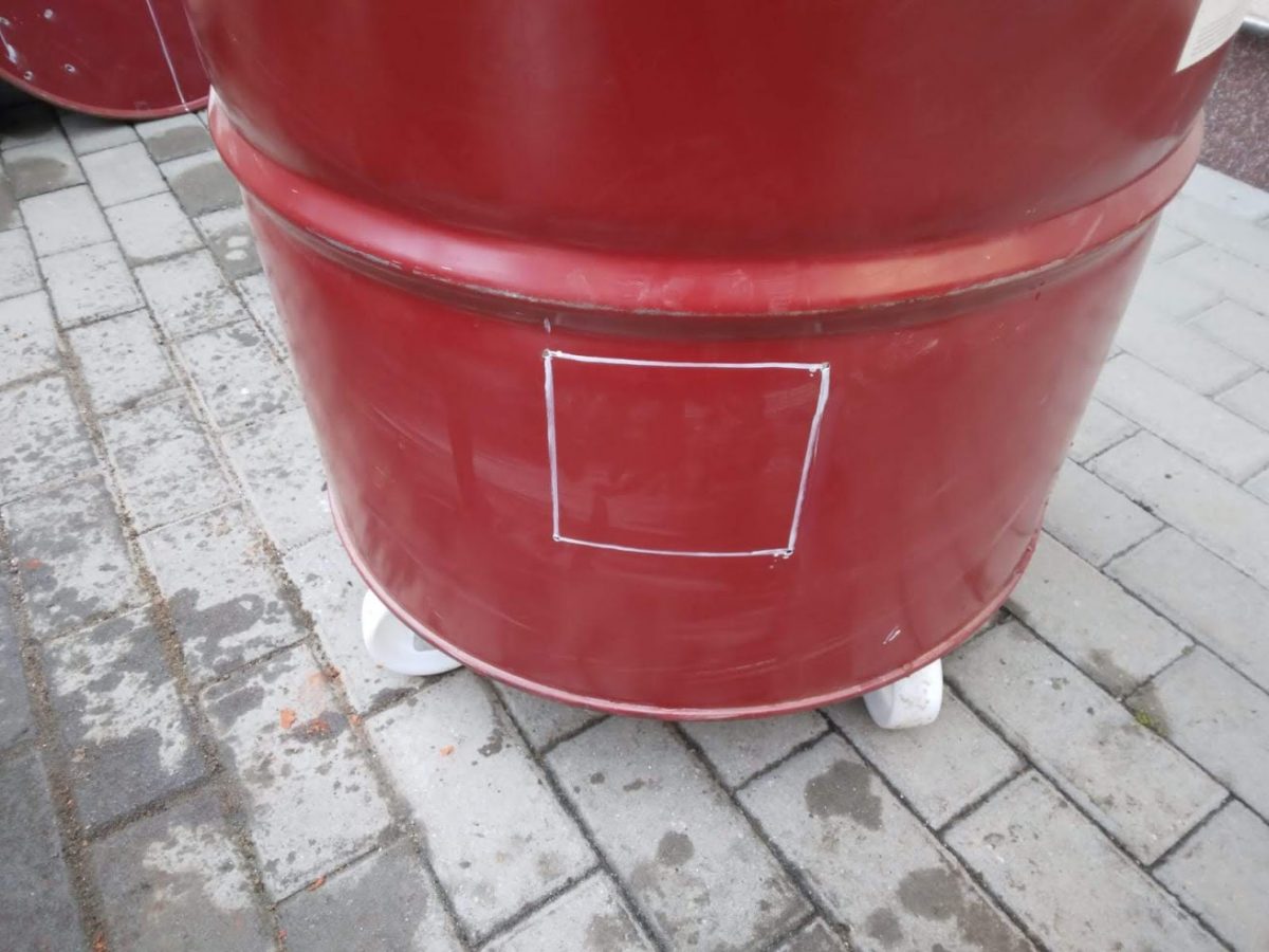 Se decupează o parte a butoiului pentru a putea lucra în interior. Noi i-am pus și roți, roți ce suportă fiecare 70kg. Două fixe și două pivotante. La operațiunea asta n-am făcut poze, dar nu-i mare lucru. Se montează cu niște șuruburi pe fundul butoiului. Se văd în poza următoare.
