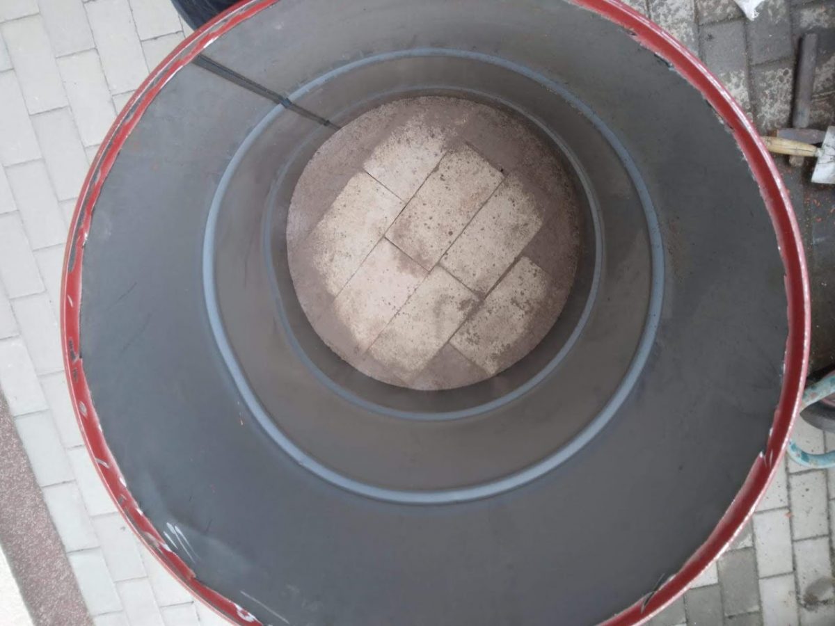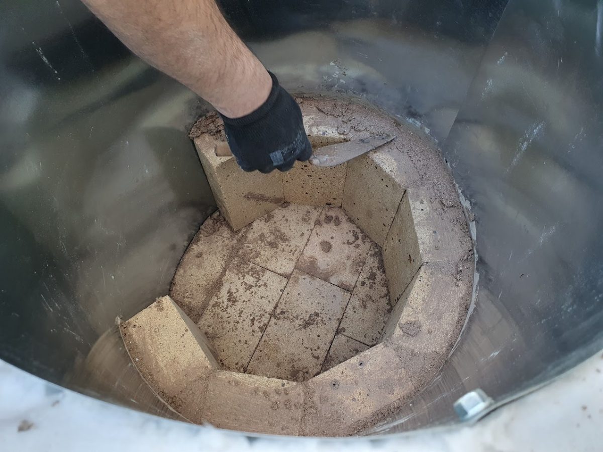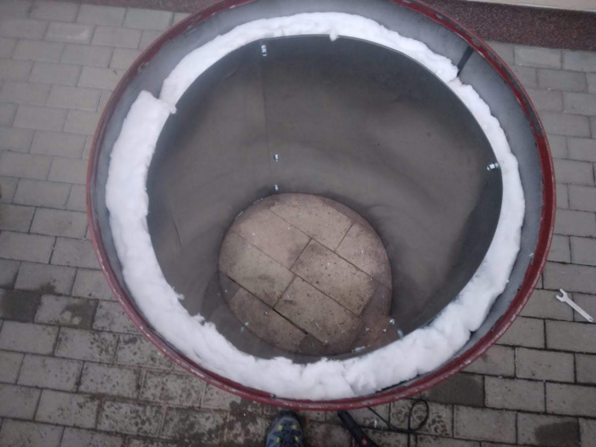 După montarea roților am pus pe fundul butoiului 2 rânduri de cărămidă refractară pe care le-am lipit cu ceva mortar special pentru cărămida refractară.