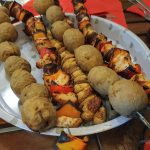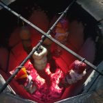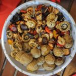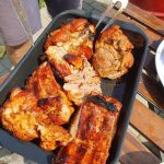 După ce focul s-a stins și rămâne jarul se pot introduce carnea și legumele. În principiu carnea/legumele se atârnă pe niște sârme, cum vedeți în pozele de mai sus. Se pot pune și pe niște plite așezate una peste alta pe o tijă filetată. Sunt multe metode, se găsesc pe net. Noi am încercat doar ce vedeți în poze, plus o jumătate de miel de la care n-am poze.