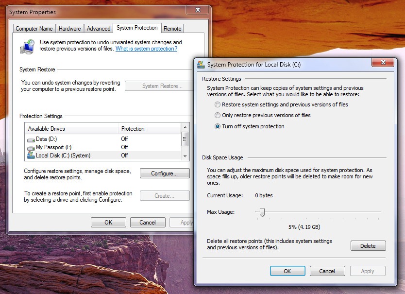 Pentru dezactivarea System Restore faceti click dreapta pe My computer si selectati Properties. Click pe System Protection din coloana stanga, apoi selectati SSD-ul, click pe butonul Configure… iar apoi bifati Turn off system protection.