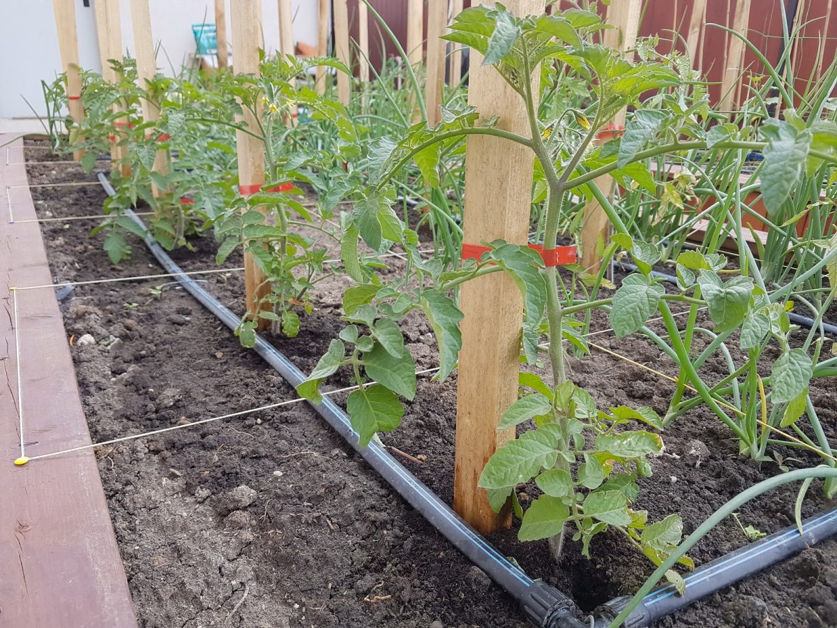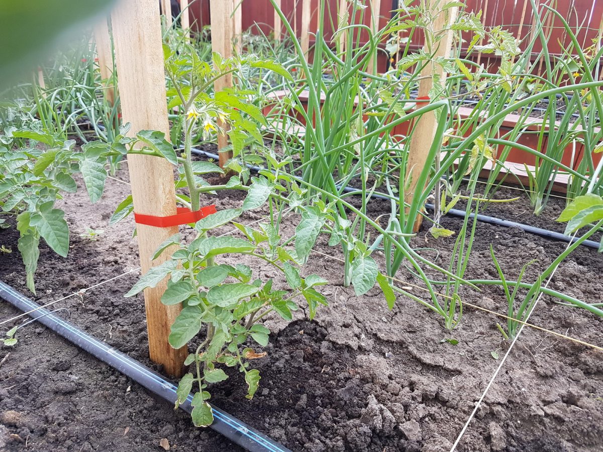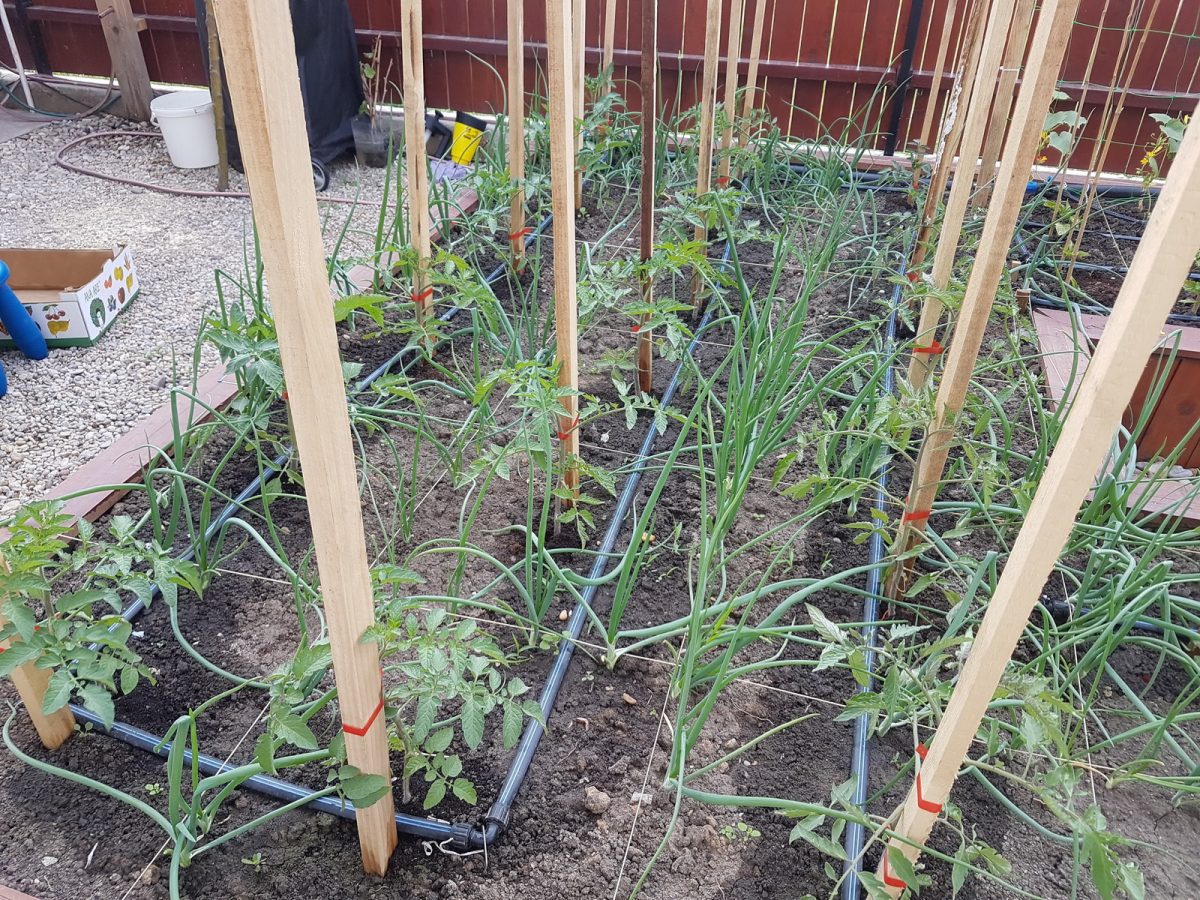 Anul ăsta am făcut niște modificări prin grădină, am renunțat la ridicatul roșiilor pe ață și le-am pus pe araci. Nu pentru că metoda pe sfoară nu era bună, ci pentru că am primit mulți araci și nu aveam ce face cu ei. Să vedem dacă e mai bine sau nu.