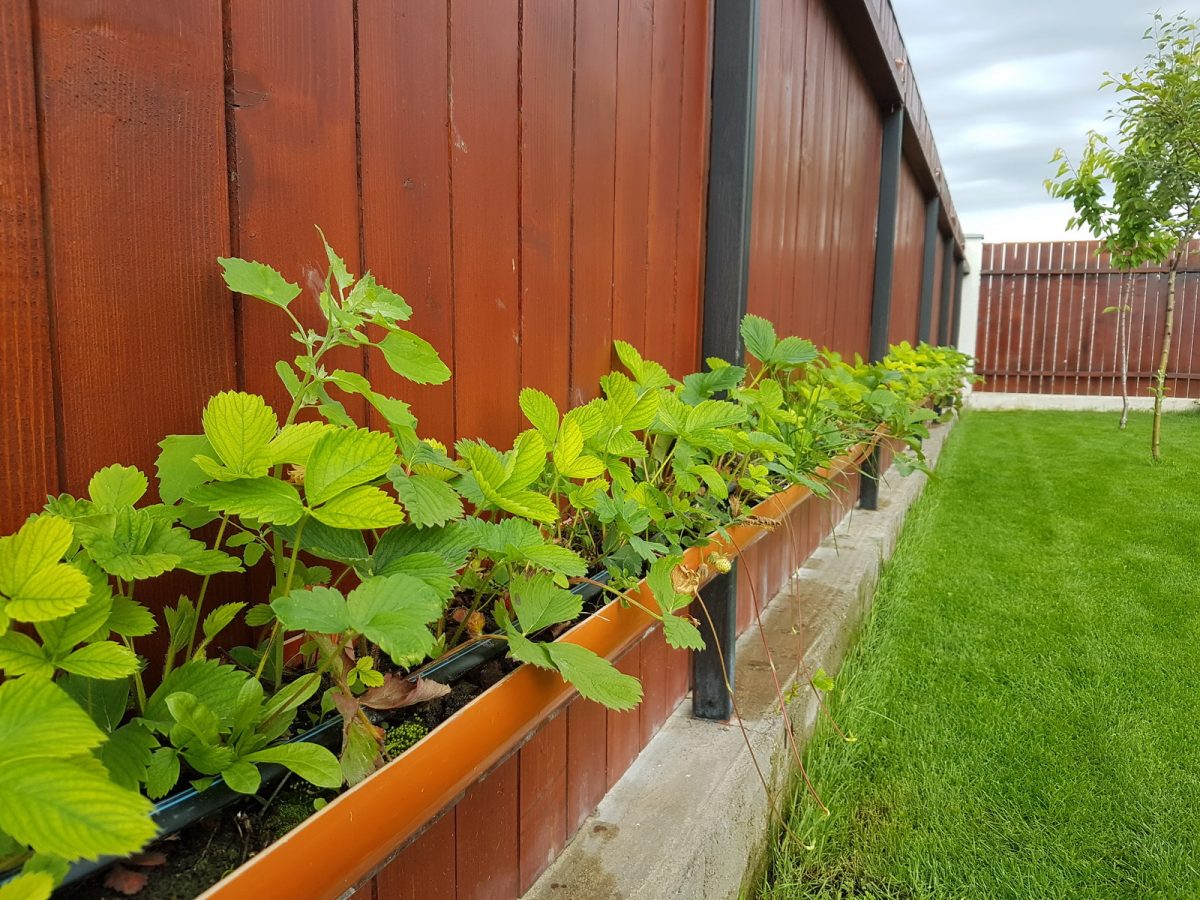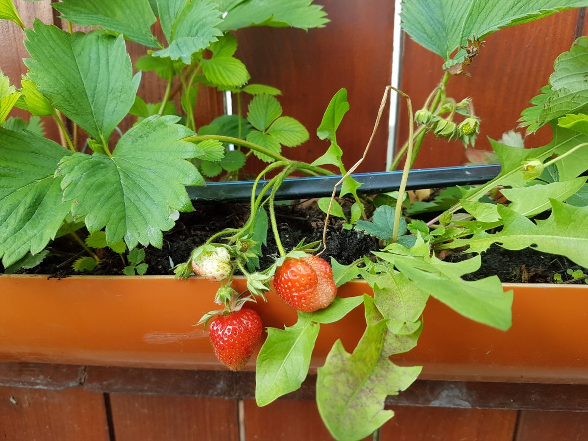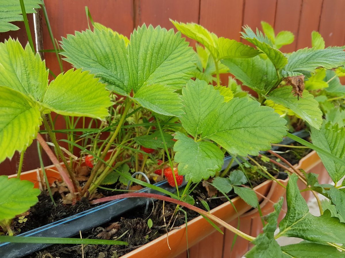 Căpșunele sunt și astea cu ceva restanță. Cele mai multe au murit peste iarnă în jgheabul ăla. Probabil prea puțin pământ. În toamnă am să încerc să-l schimb, am să pun niște jardiniere mai adânci, să aibă rădăcina mai mult loc.