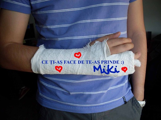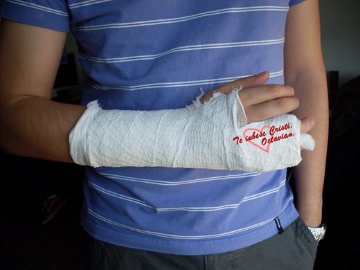 Sper sa ai rabdare sa ti ghipsul cat trebuie. Mi-aduc aminte ca ai mai avut odata mana in ghips si nu ai avut rabdare si l-ai dat jos. Cred ca nu e cazul acum.:d