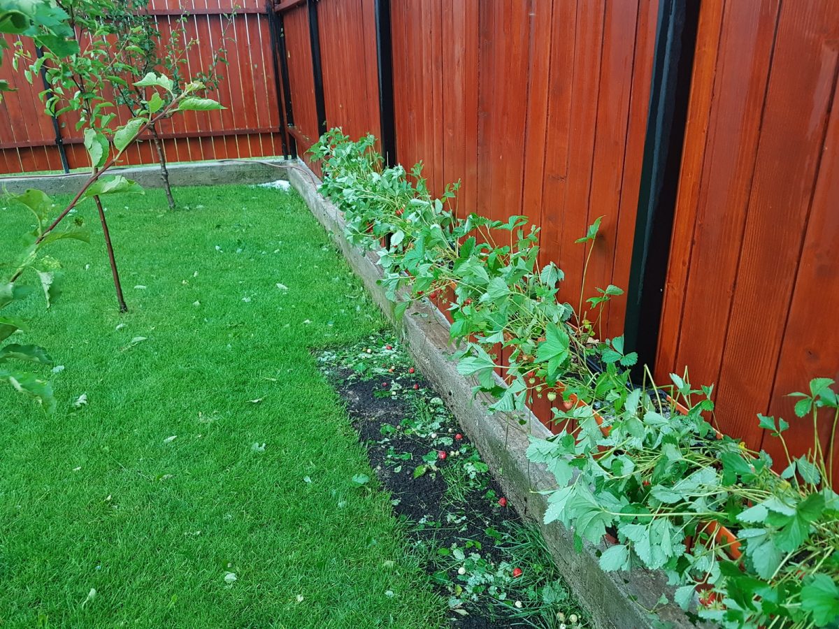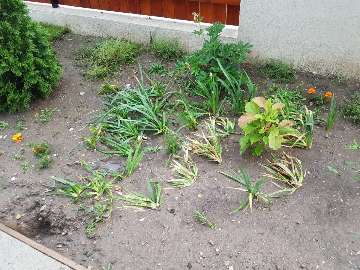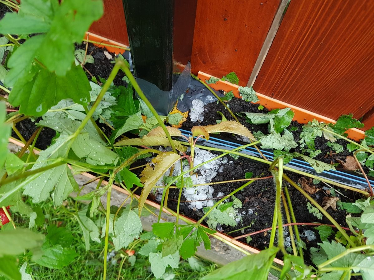 Grădina afectată și ea, dar mai puțin ca restul chestiilor. Casa a protejat grădina, grindina venind din direcția casei, spre grădină.