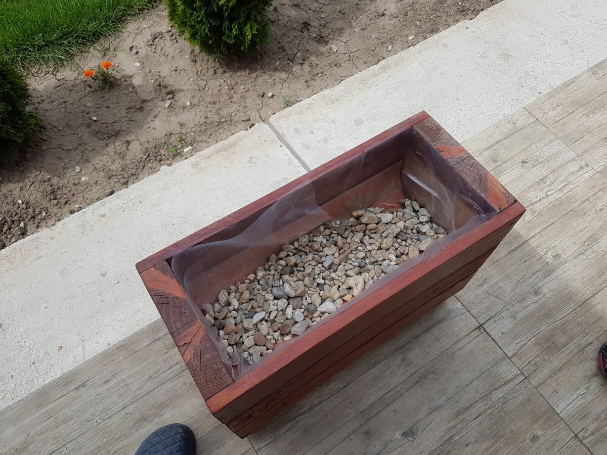 Pe fundul jardinierei am pus niște pietriș. Ajută la drenajul apei și protejează găurile din țeava de pământul din jardinieră. Sunt mai mici șansele ca găurile să se înfunde cu pământ.