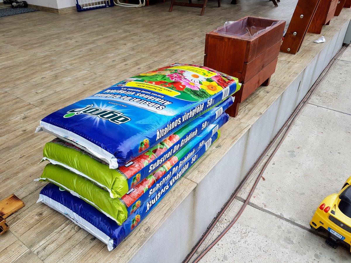 Peste am pus pământ. Ceva pământ de grădină luat de la Leroy Merlin. Undeva la ~25 lei sacul de 50L.