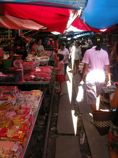 Este vorba de piata din Samut Songkhram, Tailanda. In acest orasel piata este intinsa de-a lungul caii ferate. Cand se aproprie trenul negustorii isi strang marfurile din fata trenului, iar dupa ce acesta a trecut le aseaza la loc si comertul continua.