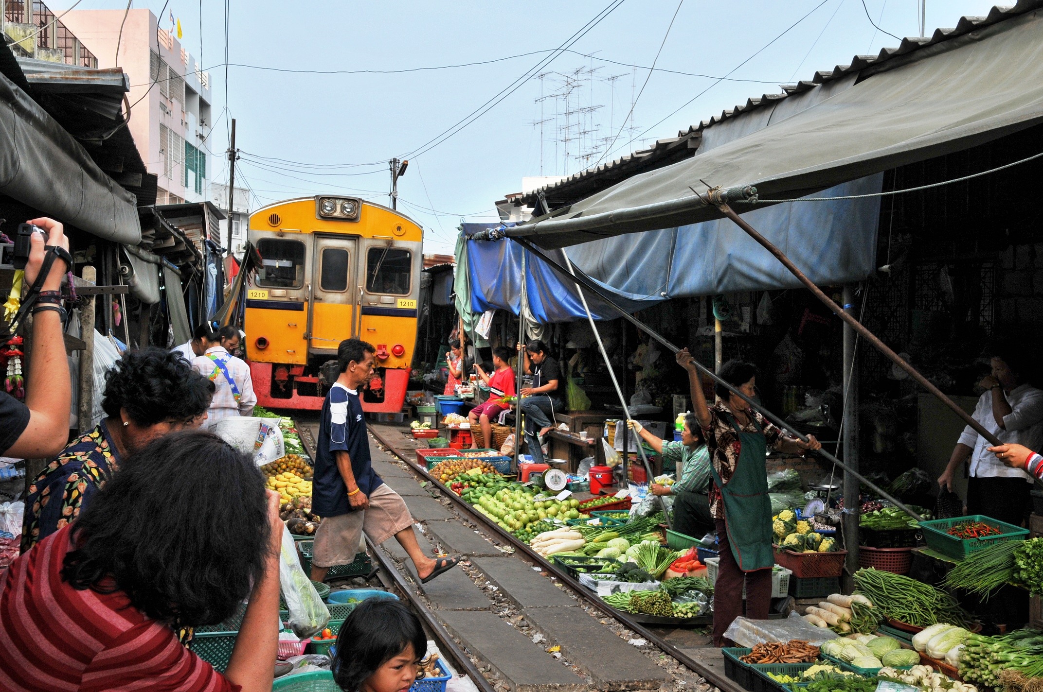 Este vorba de piata din Samut Songkhram, Tailanda. In acest orasel piata este intinsa de-a lungul caii ferate. Cand se aproprie trenul negustorii isi strang marfurile din fata trenului, iar dupa ce acesta a trecut le aseaza la loc si comertul continua.