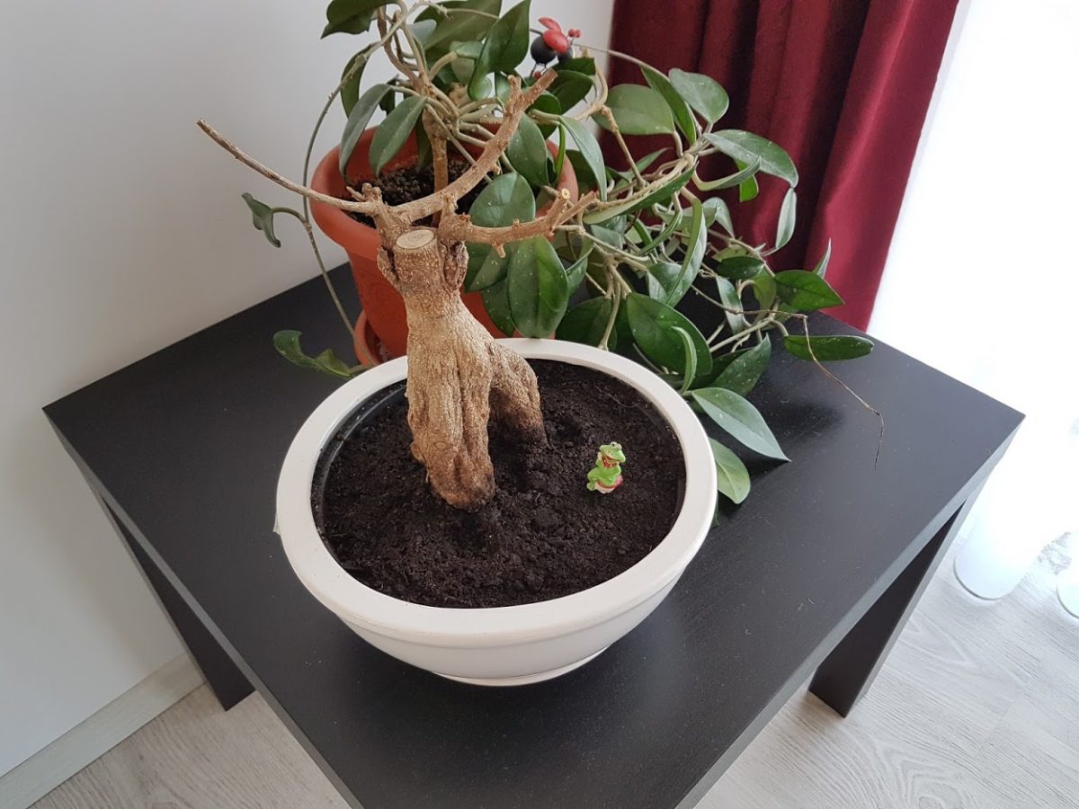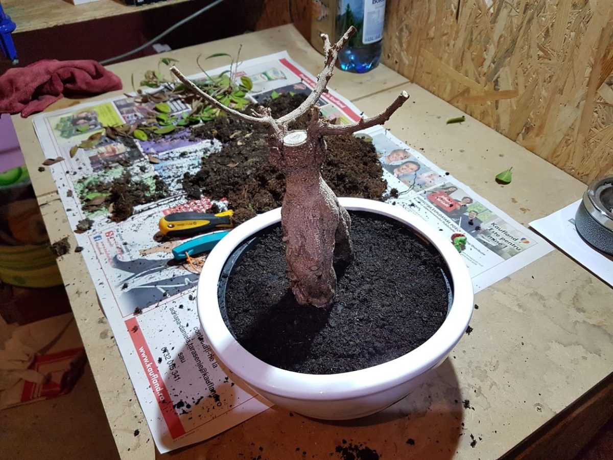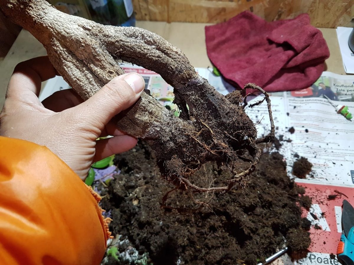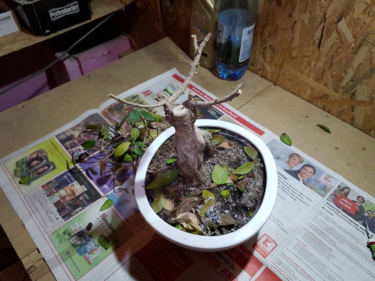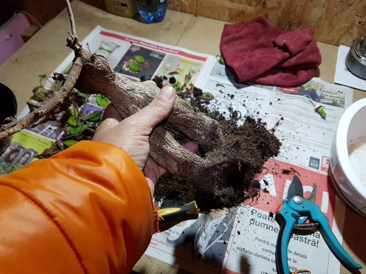 Ei bine i-am povestit și despre bonsaiul meu, i-am zis că pare pe ducă, că-i cad toate frunzele și că e cam firav, iar ia mi-a zis să fac operațiunea ce-o vedeți mai jos în poze.