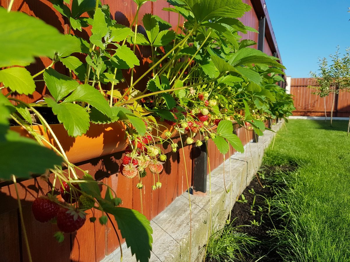 Acum două luni am ridicat căpșunile de la sol, le-am pus pe gard, într-un tub de PVC.